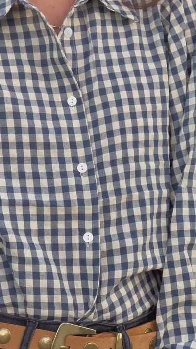 La chemise Caro, c'est l'intemporelle revisitée. Ses carreaux bleu et écru lui donnent un côté rétro, et sa coupe droite la rend facile à porter au quotidien.