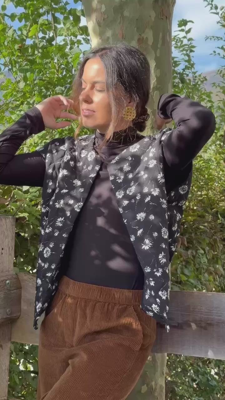 La veste sans manche Emma, avec son imprimé fleuri noir et blanc et sa coupe légèrement matelassée, donne tout de suite du style même sur un simple col roulé.