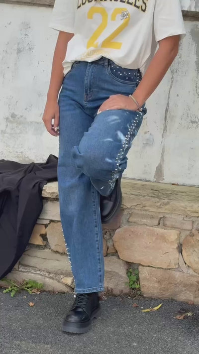 Le jean Jean, c'est le bon mélange entre caractère et féminité. Sa coupe droite, son Denis bleu et ses détails cloutés sur les côtés en font une pièce forte, pleine de style.