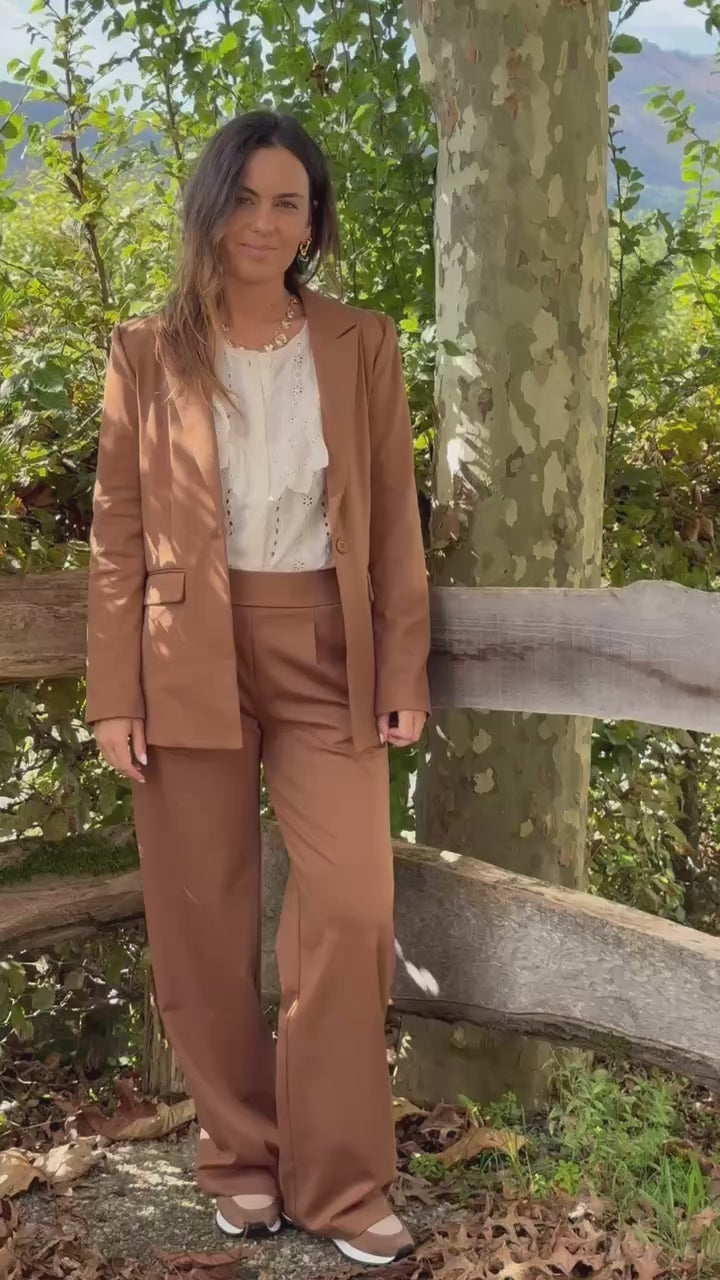 Un intemporel revisité dans une teinte chaude et lumineuse, c'est le blazer Camel. Le blazer se distingue de sa coupe droite et fluide, et de sa matière douce qui structure sans rigidité.