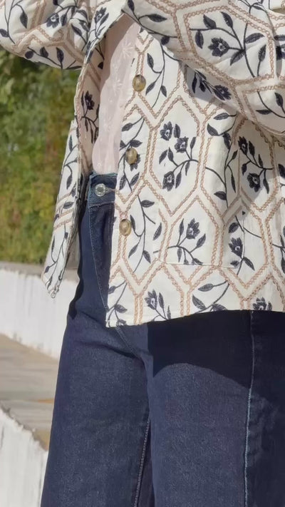 La veste Xaia attire tout de suite le regard avec ses jolis motifs brodés. Un tissu texturé, des couleurs naturelles et une coupe droite qui lui donnent une allure à la fois chic et et décontractée.